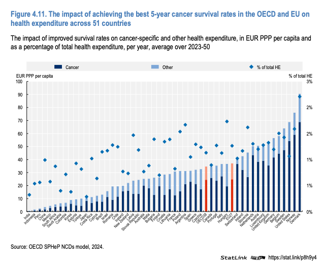 En anden rapport fra OECD, der udkom i november 2024 (Tackling the Impact of Cancer on Health, the Economy and Society – kan også downloades gratis) viser i tabel 4.11 virkningen af at opnå en forbedring af 5 års overlevelsen på cancerområdet, så man kommer på højde med de bedste tal blandt de 45 lande, der er med i rapporten, er på omkring 2,5 procent af de samlede sundhedsomkostninger for Danmark. Og Danmark er det land, som kan opnå den højeste gevinst ved at hæve niveauet til det bedste blande de 45 lande.