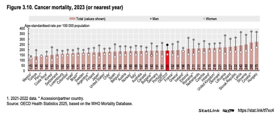 Kræftdødelighed. Danmark har en 8. højeste dødelighed blandt de mere end 40 lande, der indgår i OECD’s tal. De lande, som har større dødelighed end Danmark, er alle lande fra Central- og Østeuropa som Ungarn, Polen, Litauen osv. Kilde: Health at a Glance