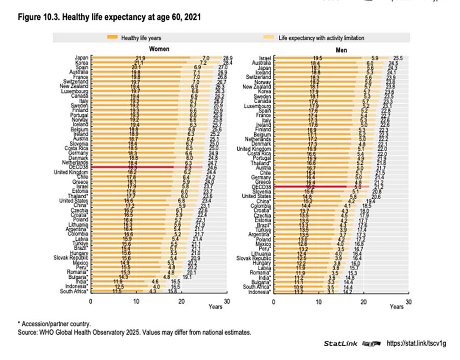 Antal sunde leverår tilbage ved 60. år. Danmark har relativt få sunde leveår i forhold til de lande, vi normalt sammenligner os med. Kilde: Health at a Glance