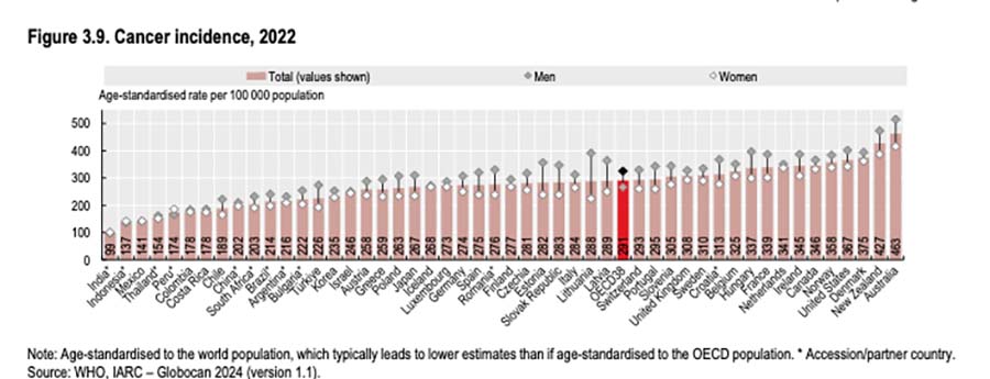 Tallene for cancer incidensen i OECD’s 38 medlemslande plus nogle ekstra findes i figur 3.9, og de seneste sammenlignelige tal er fra 2022. Danmark ligger højest i Europa, og er nummer 3 på globalt plan – hvor Australien og New Zealand er foran. Men den danske cancer incidens er højere end for eksempel i USA og som sagt højere end nogen andre lande i Europa.