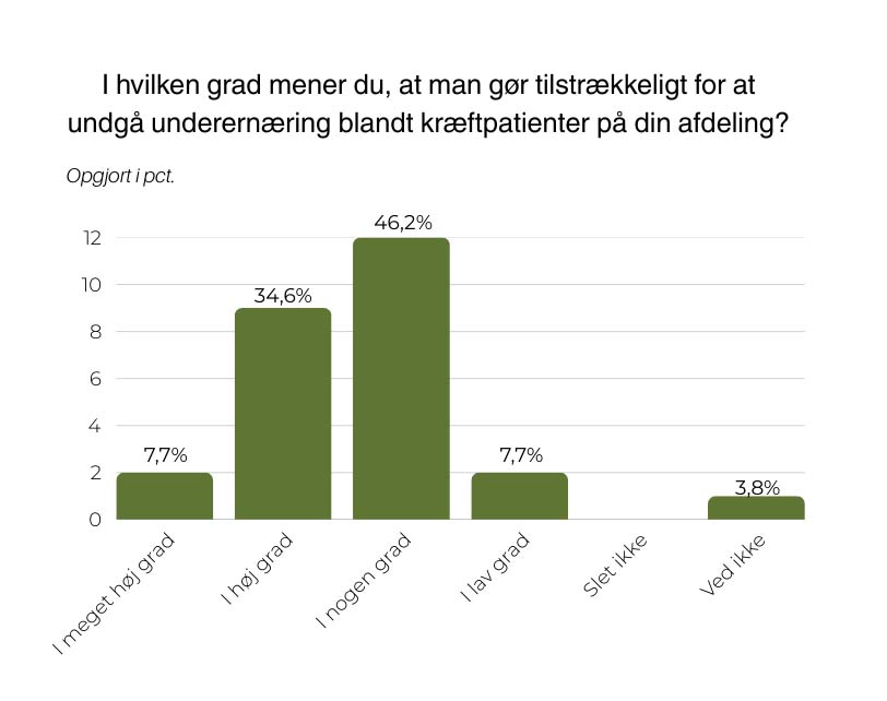 I undersøgelsen svarer 62 procent af de yngre onkologer, at de er ”meget enige” eller ”overvejende enige” i, at underernæring er meget udbredt blandt deres kræftpatienter. 77 procent er ”meget enige” eller ”overvejende enige” i, at onkologer bør spille en mere aktiv rolle i forhold til ernæringsindsatsen. Men 54 procent svarer, at man kun i ”nogen grad” eller ”lav grad” gør tilstrækkeligt for undgå underernæring blandt kræftpatienter.