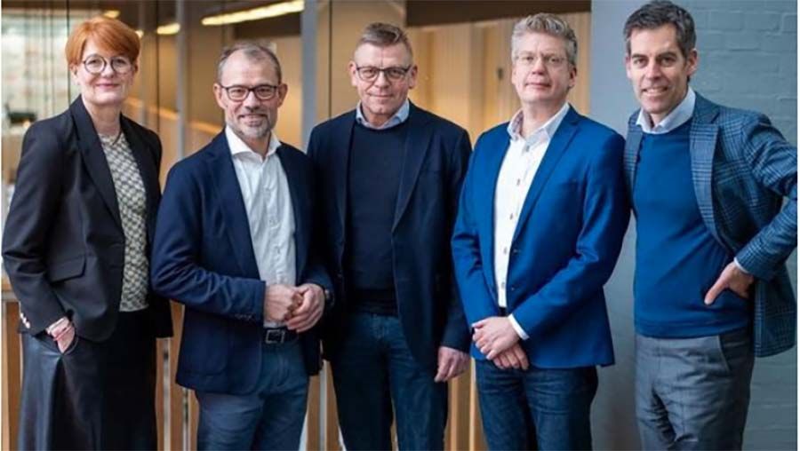 Anne Skriver Andersen, Jesper Gyllenborg, Martin Magelund Rasmussen, Erik Jylling og Jens Gordon Clausen udgør den samlede koncerndirektion for Region Østdanmark. Foto: Region Østdanmark