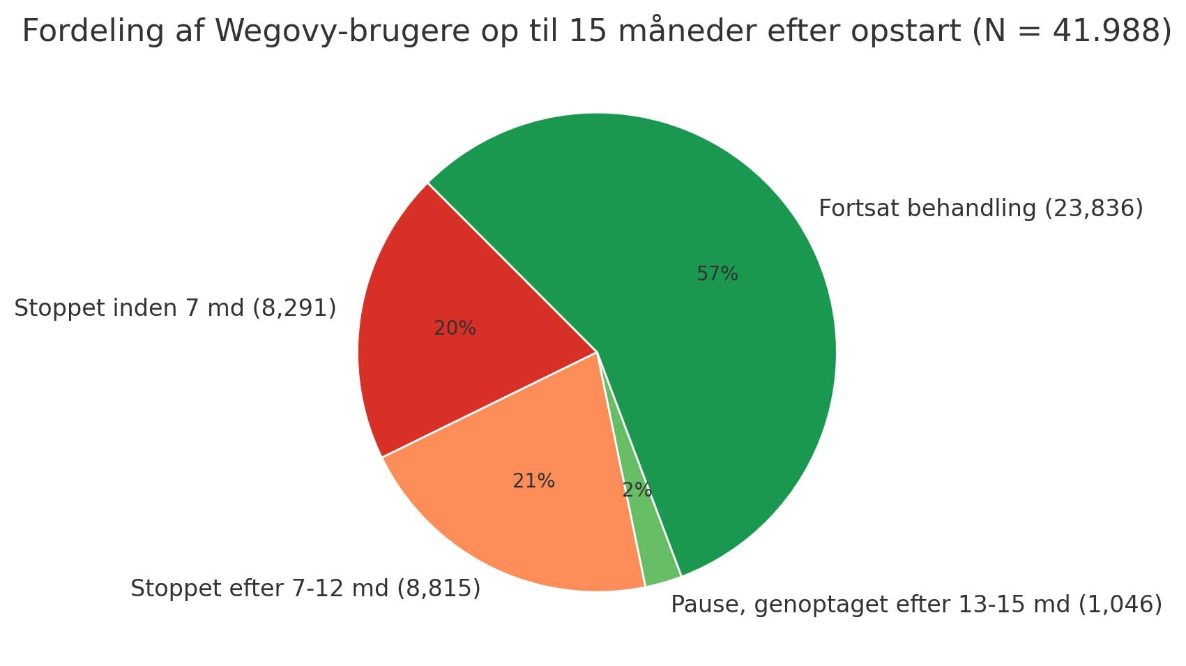 Den nyeste årsrapport fra databasen for svær overvægt (DBSO) viser for opgørelsesperioden (juli 2023 til juni 2024), at knap 20 procent af brugerne afbryder behandlingen med Wegovy inden syv måneders brug, mens yderligere 20 procent stopper efter op til 12 måneders forbrug.